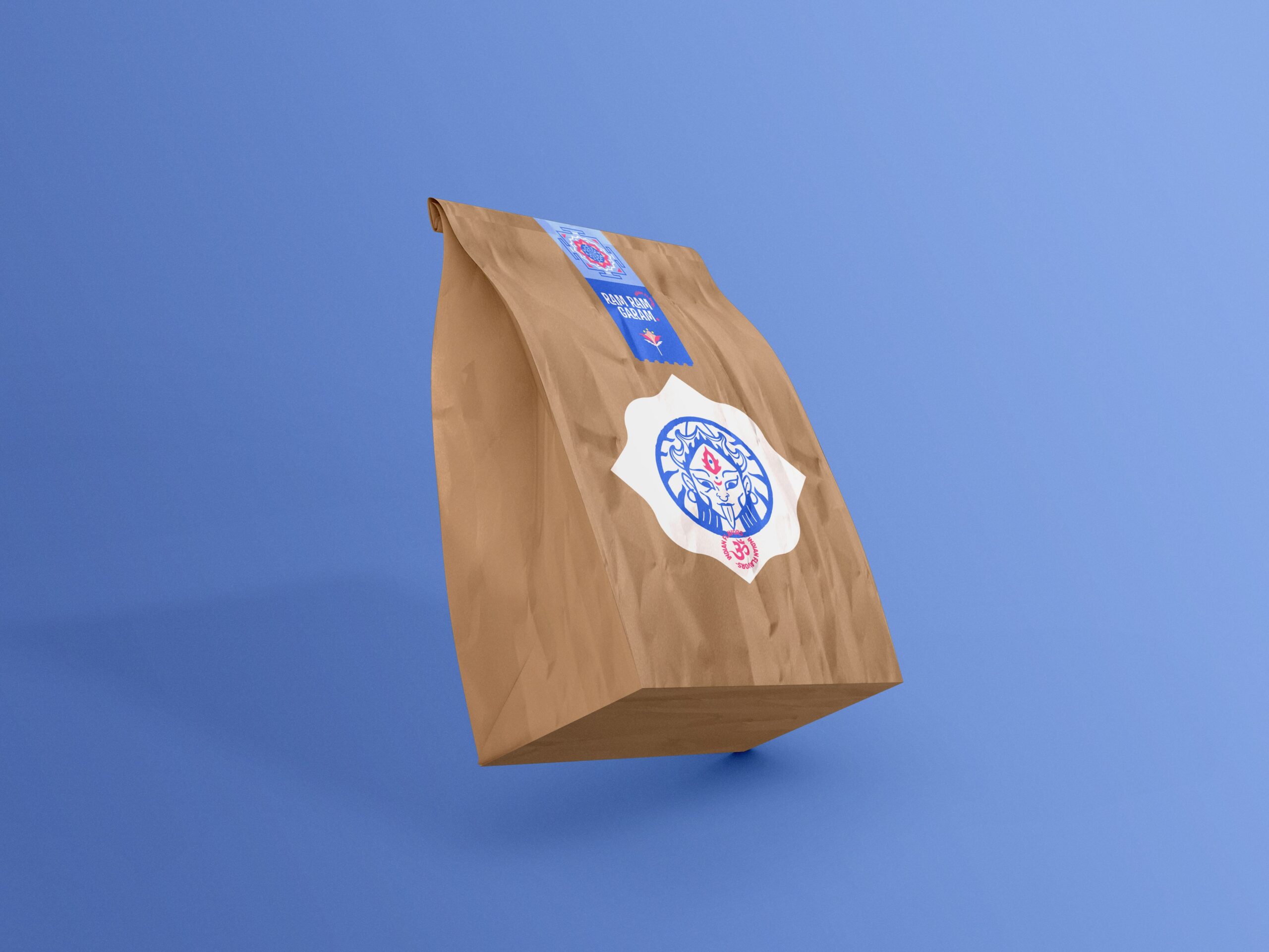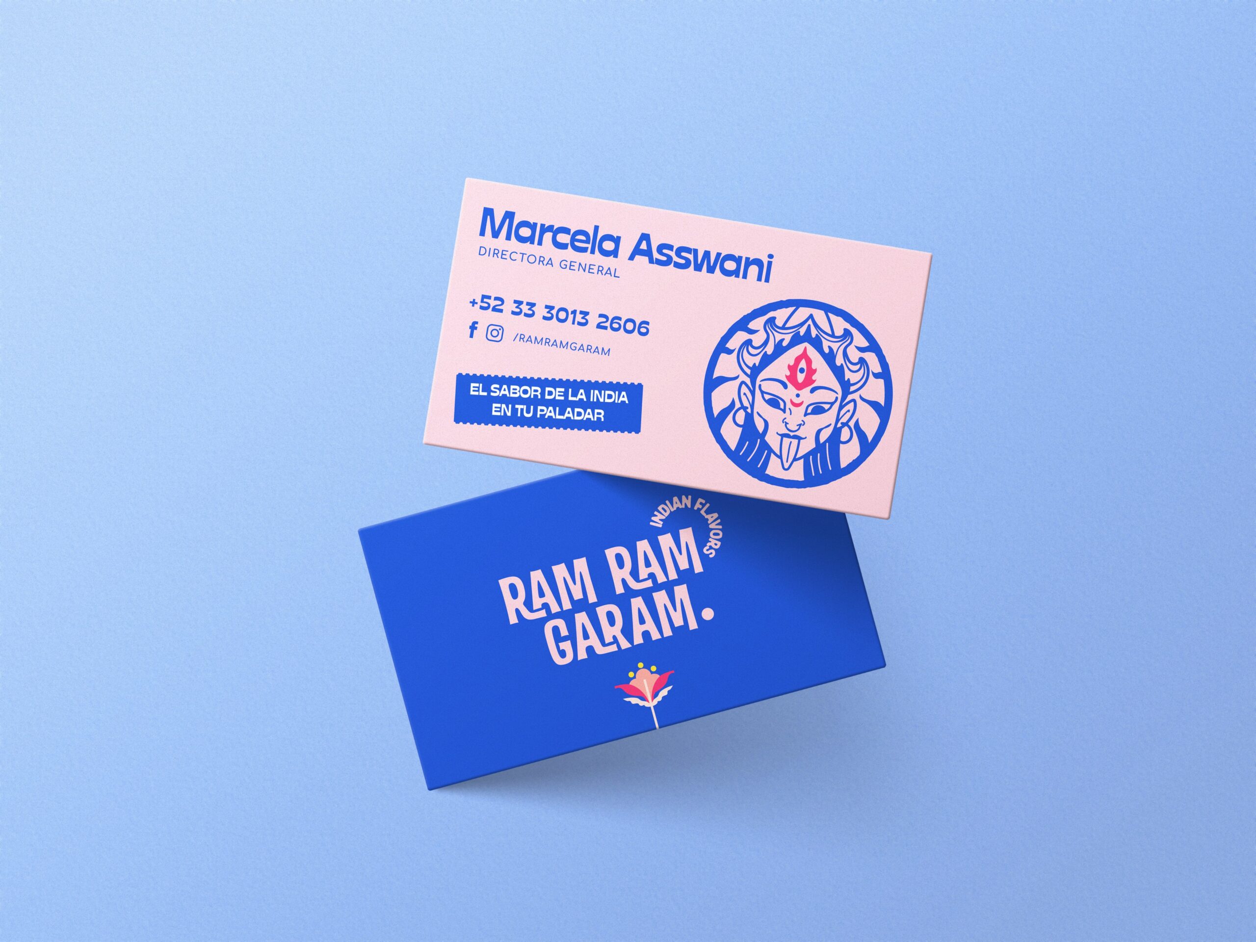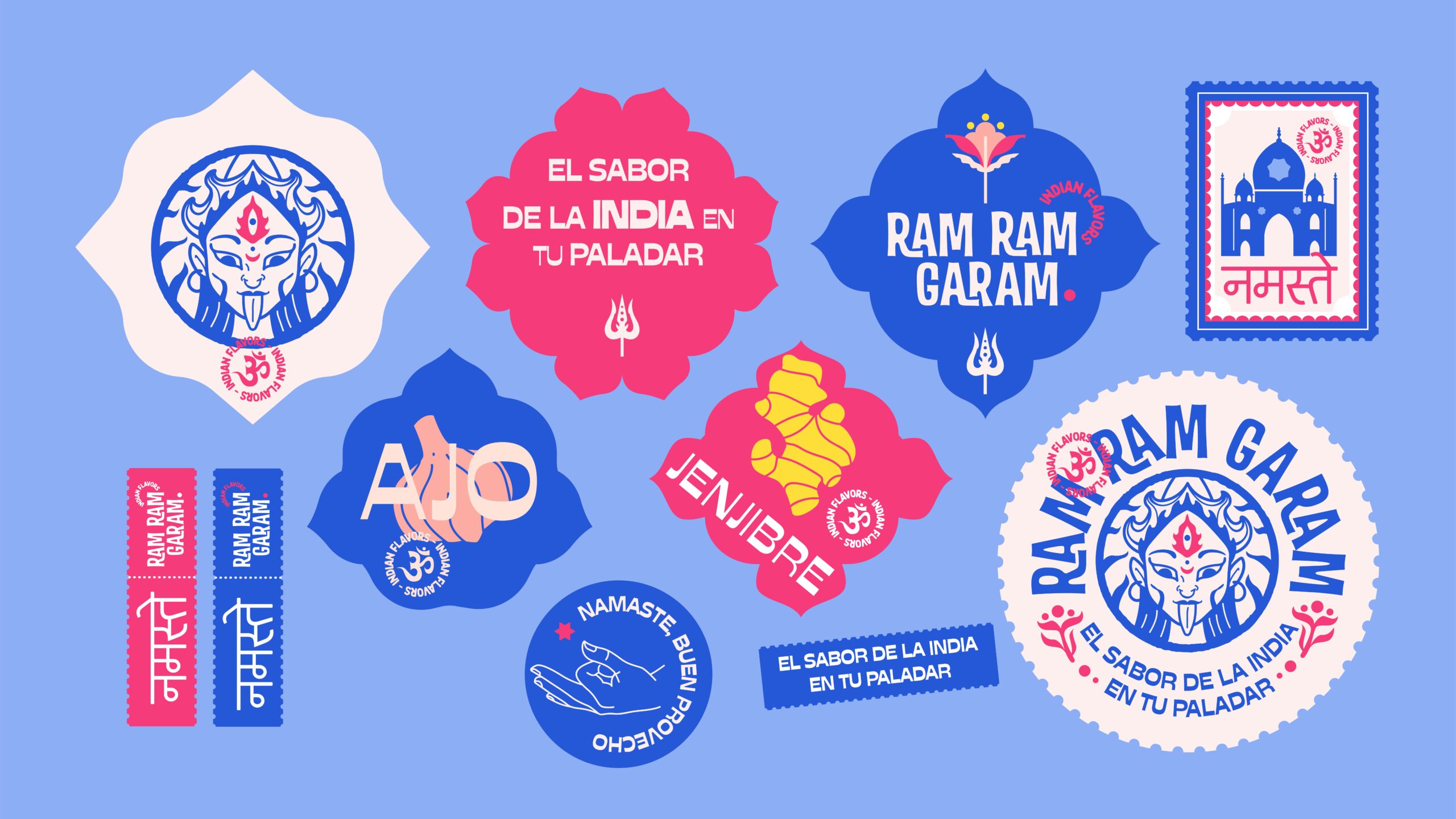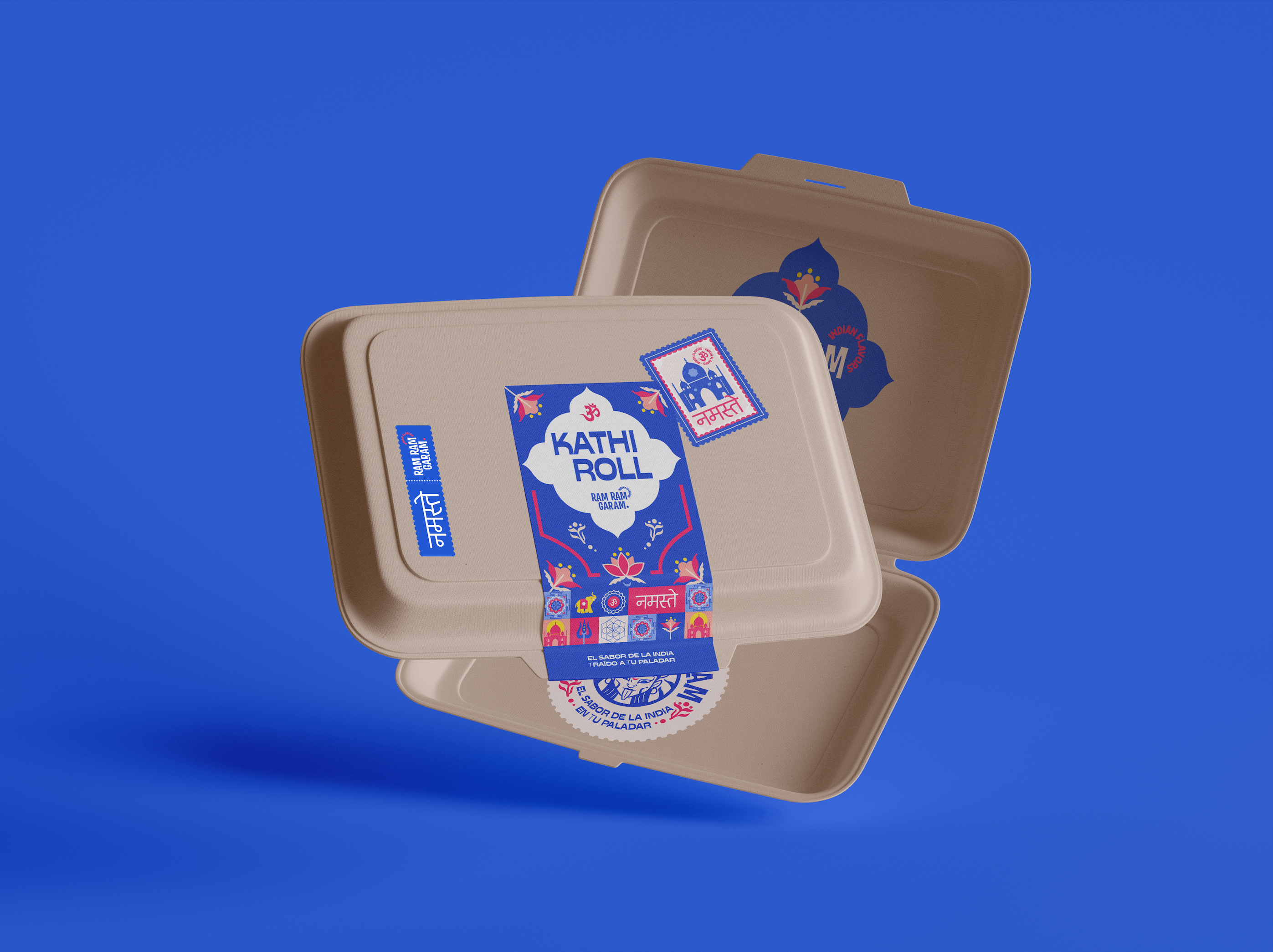Tomamos como eje central a la diosa Kali, reinterpretada como pictograma dentro de un círculo, haciendo alusión al Kati Roll —el producto estrella— y envolviendo al fuego como símbolo de preparación y transformación.
